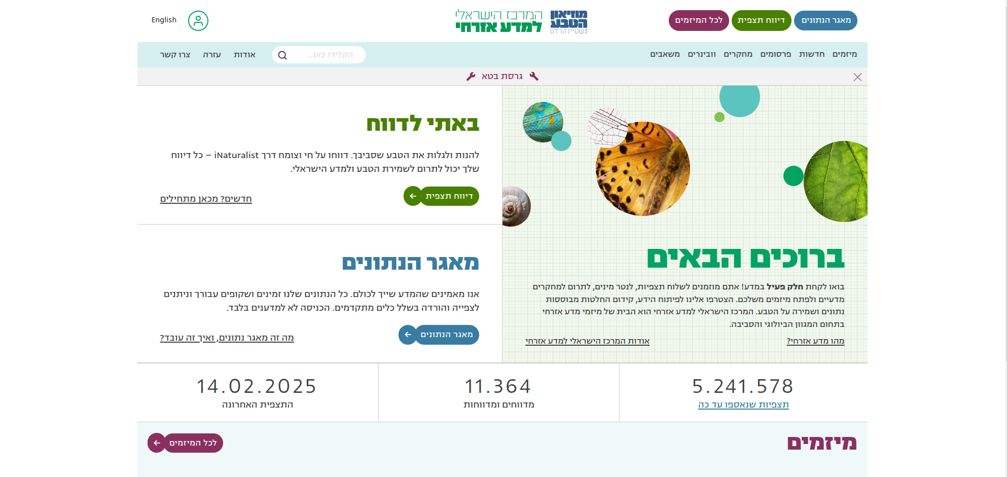 The Israel Center for Citizen Science at the Steinhardt Museum of Natural History was launched in early 2025 to promote public participation in environmental research and advance biodiversity science and conservation in Israel. The center fosters sustainable technological, scientific, and social approaches to strengthen the foundation of citizen science in the country. It serves as a national hub, providing knowledge and support for both existing citizen science programs and future initiatives.
